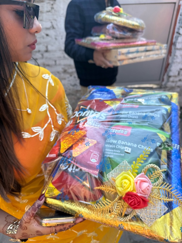 Because we are part of the groom's family, we are considered in the higher position of the marriage. Having only attended weddings from the bride's side, I have yet to encounter this kind of treatment. I was asked today to accompany a group of the groom's elders to go to the bride's house to deliver the turmeric, gifts, and lots of other items. We were immediately greeted by the bride's family and warmly invited into their home, seated in a comfortable room and given snacks upon snacks.