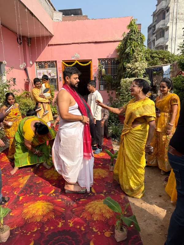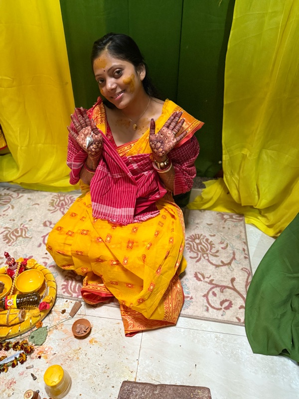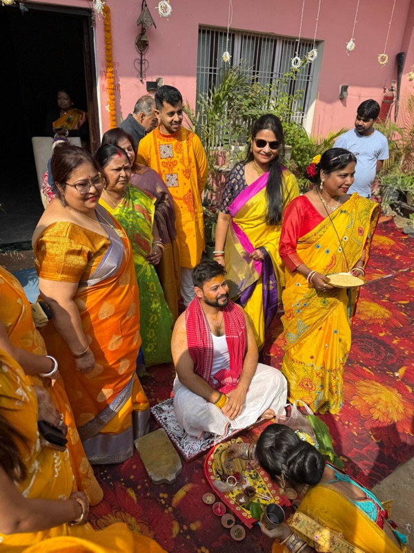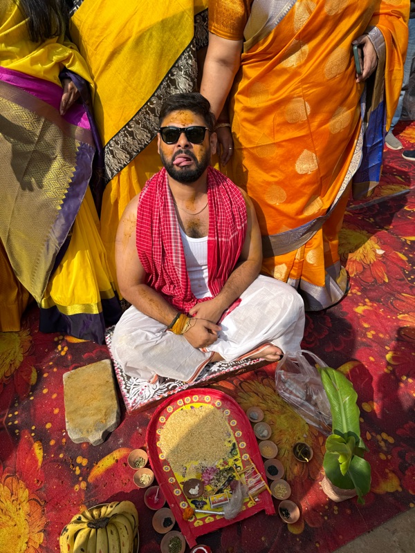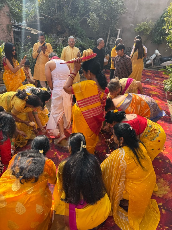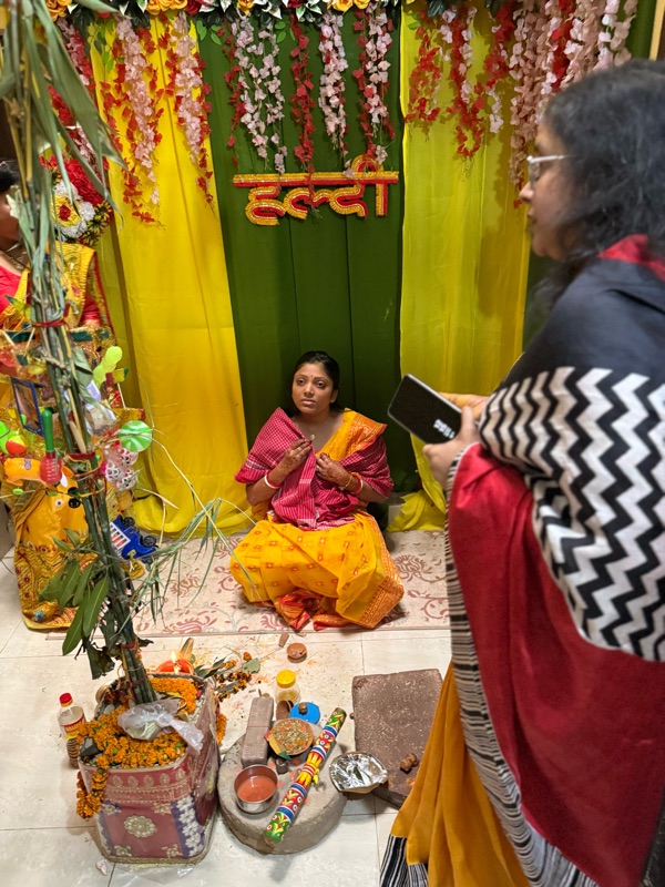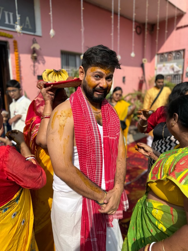 I was aware from prior weddings that the morning or day before a ceremony is held where a turmeric paste is smeared on the body of the person getting married, a bunch of rituals and things are done to the person, primarily by married family ladies, and then that same turmeric paste is scraped off and brought to the other person's house and the same is done to them. Although I'm not big on rituals, I've always thought this one was quite romantic.