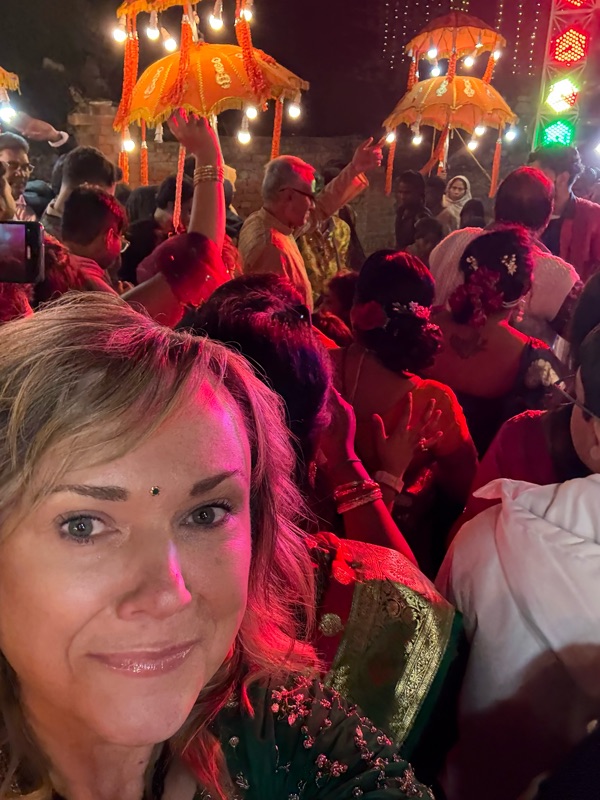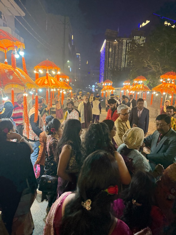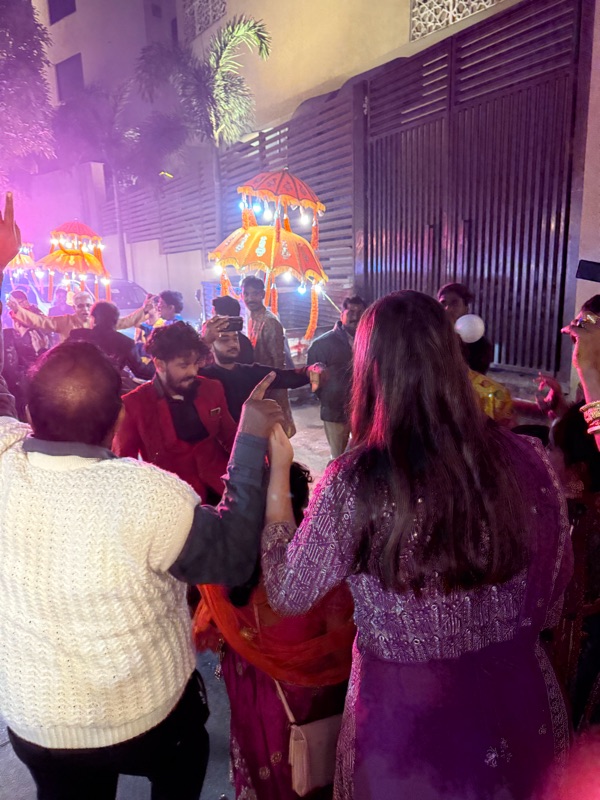 We finally arrived at the designated location to find loud music, snacks, tea, and a full band. The groom in the decorated car was also sitting here patiently waiting. We then proceeded to follow this band, truck blaring loud music, and these people holding lighted umbrellas all the way to the wedding venue while family members danced down the street. It was WILD.
