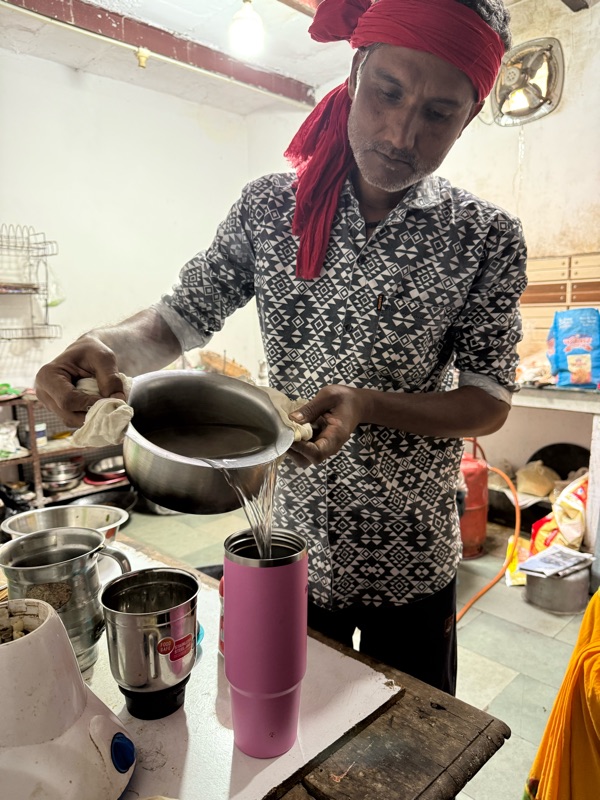 There is a certain fun camaraderie that comes from staying like this for 4 days. Although cramped and more rustic than I would normally prefer, it worked out just fine and added to the fun of the occasion. As normal family gatherings occur, a few of the older uncles end up taking charge of the kitchen activities and help with picking up groceries, dictating the menu, and directing the kitchen workers on making tea and snacks. The first morning, I was asked what I wanted to eat or drink (they never seem to know or are quite sure if I will ever find food without them), and I asked if there was coffee. One of the in-charge uncles ran out for some, as most of the folks here drink tea. By the end of the 4 days, I was working directly with the kitchen folks, and they were experts in American-style coffee. They seemed to enjoy me showing up with my huge pink Stanley and knew exactly why I was there. In broken English/Hindi, we bonded over stories of home, food, and drinks.