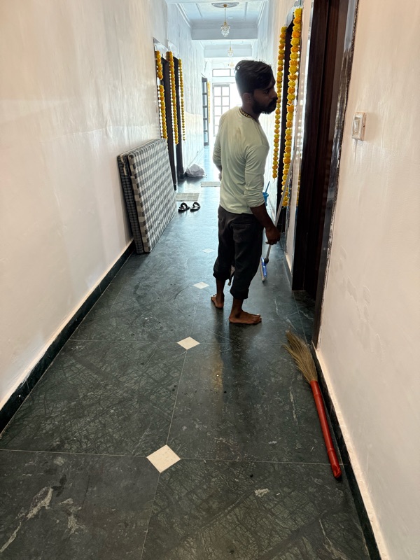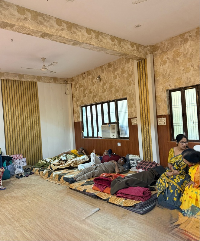 Roy swears he told me we were staying at a 'lodge' during the wedding days, but I am certain if I had heard this word, I would have questioned more about what exactly this is. As with most things in India, familiar names are not what they mean back home. I pretty much knew I wasn't in for a mountain top rustic hotel overlooking ski slopes with a roaring fire; in fact, the only thing correct was the 'rustic' part. Not so much in a charming way, but more in a basic way. It turned out to be fine, and in fact was fun to occupy this entire place with family members, wedding rituals, and impromptu dance parties. The lodge is basically like a guest house or boutique hotel that you can rent a room in or the entire place (as we did), including the kitchen area and banquet hall. The 'catering' involved is hiring your own cooks and bringing in your own food for them to prepare on some type of schedule each day. The lodge had something like 10 actual rooms (with attached bathrooms), but many of the older relatives opted to sleep on mattresses kept around the perimeter of the banquet hall. Sleeping on the floor, and next to whomever you wind up next to, is really common here and doesn't seem to bother anyone much. I suppose if a room with a bed were available, they would take it, but in its absence, this seems to work just fine for the overflow folks.
